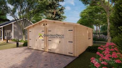 Garage in legno massello a due posti auto. Ideale come rimessa per le auto è dotato di 2 portoni carrabili in legno massello e di una porta pedonale che rende più comodo e rapido accedervi è acquistabile in 5 diverse colorazioni: abete, rovere, castagno, noce e bianco.Viene data la possibilità di aggiungere delle tegole bituminose di colore verde o rosso, una grondaia e di sostituire i 2 portoni carrabili con dei portoni basculanti ad apertura manuale.