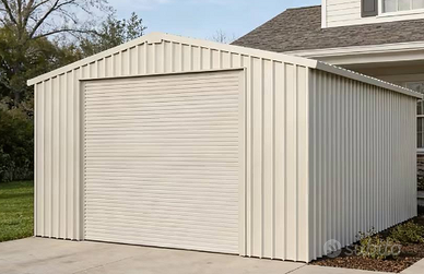 Vendo garage magazzino in lamiera con porta a saracinesca, nuovo ancora smontato e su imballo come da foto, misure cm. 800 x 400 x H. 240, colore beige.