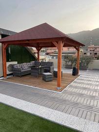 Si realizza gazebo lamellare su misura, il prezzo e’ riferito a misure 4x4 mt senza pavimento. Compreso trasporto (fuori provincia di Oristano con supplemento), montaggio, trattamento antitarlo, impregnante colore a scelta e tegole canadesi!