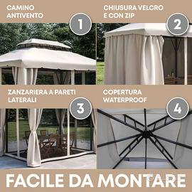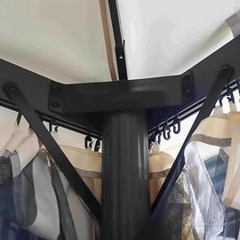 Zanzariere Incluse: Il gazebo è dotato 4 zanzariere e 4 pareti laterali appese con ganci alla struttura al centro è presente una cerniera per chiudere i pannelli tende e zanzariere possono essere legate ai lati