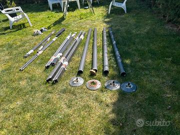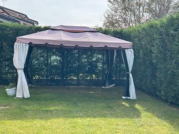 Gazebo in alluminio misure 3x4 completo di tende e zanzariere. La struttura e in buone condizioni . Una base del gazebo è rovinata ed ho apportato una modifica , le altri basi presentano un po di ruggine ma sono in buone condizioni. Telo superiore sostituito con uno molto piu resistente l’estate scorsa .Il gazebo e tutto smontato pronto per essere trasportato