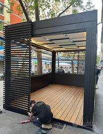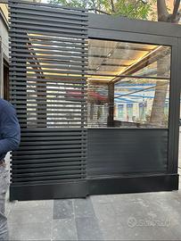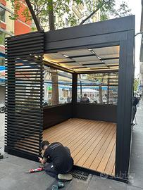 Gazebo con struttura in ferro con copertura in plexiglass, porta richiudibile a chiave, tende laterali a scorrimento in pvc, pedana, impianto elettrico ed illuminazione a led per il perimetro interno. Ottime condizioni