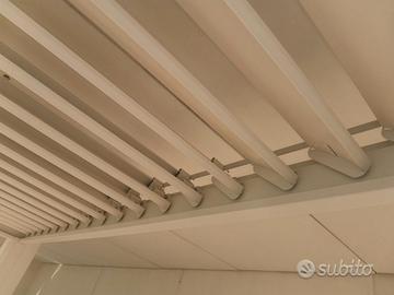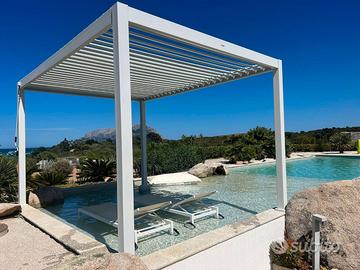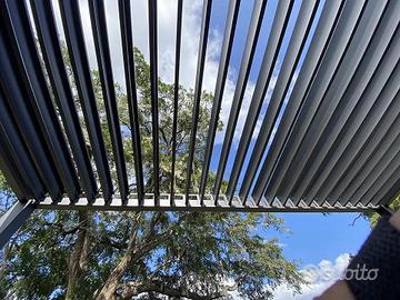 Pergola frangisole autoportante con telaio totalmente in alluminio a lamelle orientabili con meccanismo manuale.