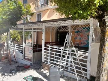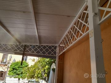 gazebo 7,50 per 3 mm,struttura ferro zingata verniciata ,tetto in pannelli coibentati. il gazebo è in ottimo stato solo da verniciare qualche graffio di spostamenti. pedana in lamiere di ferro però da ricostruire. da ritirare in loco