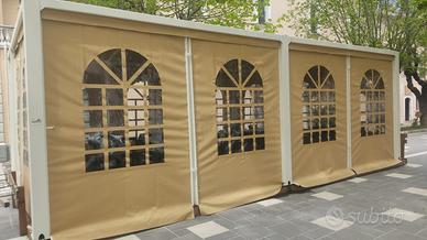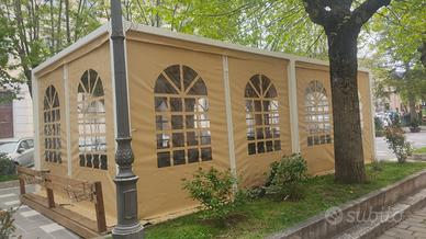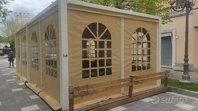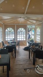 Vendo gazebo per bar o ristorante, misure ml 8×4, apribile su 4 lati, struttura metallica con pedana in legno, chiusura con porta metallica, doppio tetto alto carico adatto anche per zone montane. Completo di 8 tavoli e 24 sedie. Come nuovo acquistato settembre 2024. Cedo per cessata attività. Da smontare. Pagato € 20.000 vendo a € 12.000trattabili