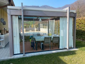 Gazebo in ferro con chiusura in vetro trattato scorrevole su quattro lati, tetto sempre in vetro antigrandine con relativa copertura elettrica inserita nel guscio . Le tende vengono lasciate in dotazione. Il tutto è stato realizzato cinque anni fa, con un prezzo di acquisto di 17000 euro.