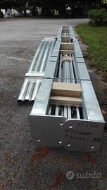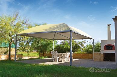 gazebo cicogna minimax 5x5 nuovo in stock.altezza sottotrave standard 240 , struttura zincata certificata CE , montanti 80x80 travi perimetrali 80x80 travi del tetto D.60 raccolta acqua piovana dentro le travi gronde,e scende dentro i montanti,esce tramite appositi fori posti in basso .telo pvc da 650 gr/mq certificato ignifugo .possibile formire le chiusure laterali scorrevoli apribili centralmente o su misura ,finestrature a richiesta.produttore sprech srl .trasporto in tutta italia da concordare.