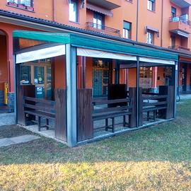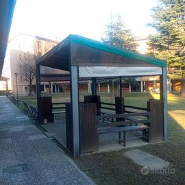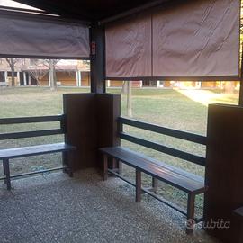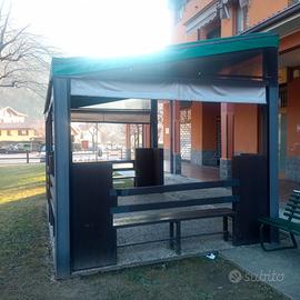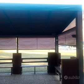Dehor mt 5,00x3,00 costruito in opera, solidissimo, qualsiasi prova, con struttura in ferro, pavimentazione in pianelle di cemento, copertura con pannelli di legno e telone in PVC, tende laterali ombreggianti avvolgibili.
