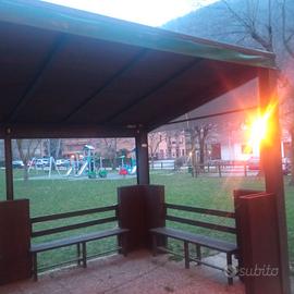 Dehor esterno mt 5,00 x 3,00 in ferro, completo di pavimentazione, tetto in legno e telo in PVC, panche e muretti fioriere angolari , tende oscuranti a rullo, illuminazione.