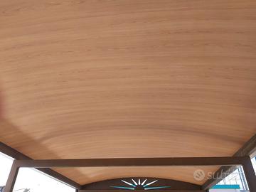 Vendo gazebo dim. 3.220x6.065 mm H 2.800 mm realizzato con struttura in acciaio zincata a caldo e verniciata Corten, copertura con pannello curvo sp. 4 cm colore rosso siena esterno e finto legno interno come da foto, completa di lattonerie di bordatura, canale di gronda e tubi di scarico.