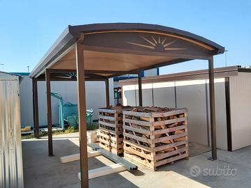 OCCASIONE A MAGAZZINO Vendo gazebo dim. 3.220x6.065 mm H 2.800 mm realizzato con struttura in acciaio zincata a caldo e verniciata Corten, copertura con pannello curvo sp. 4 cm colore rosso siena esterno e finto legno interno come da foto, completa di lattonerie di bordatura, canale di gronda e tubi di scarico. La struttura montata è attualmente visibile presso la ns. sede in Villa Bartolomea (VR). Prezzo escluso di trasporto e montaggio. Il tutto più Iva a norma di Legge.
