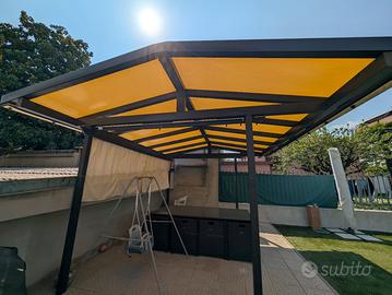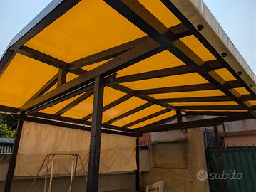 vendo per cambio progetto, gazebo autocostruito in legno trattato e verniciato di nero, le 4 gambe sono in alluminio fibrorinforzato, le dimensioni sono di 4,5 x 4,5 metri , il telo è da 650 g/m² colore beige ed è fissato con dei ganci rapidi ogni 50cm, molto resistente a forte pioggia e grandine, dotato anche di canaline laterali. prezzo di vendita che equivale solo al telo praticamente, costato più di 1800€ in totale trasporto a carico vostro.
