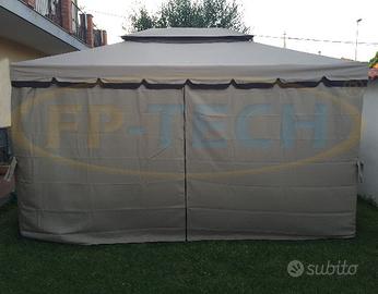GAZEBO 3X4 GIARDINO IN ALLUMINIO TELO ANTIPIOGGIA PVC ZANZARIERA TELI ANTIVENTO COLORE BEIGE CON BALZA MARRONE