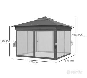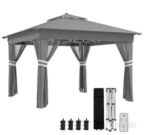 Gazebo da Giardino ad Altezza Regolabile con Luci LED, in Acciaio e tessuto Oxford, 336x336x250-270 cm, colore grigio. Nuovo ancora imballato nella sua scatola. LUCE LED A ENERGIA SOLARE: è dotato di un pannello solare sul tetto che consente di immagazzinare l'elettricità prodotta dalla luce solare durante il giorno per l'illuminazione notturna. Le luci solari possono fornire fino a 6 ore di illuminazione ed è incluso un telecomando per l'accensione e lo spegnimento, la regolazione della luminosità e della modalità. TENDE E RETI: è dotato di 4 tende che proteggono dalle intemperie e dalla privacy, creando una sensazione di freschezza e brezza durante la bella stagione STRUTTURA PORTATILE: pieghevole con sponde può essere montato in pochi minuti da 2 persone e senza bisogno di attrezzi. La confezione include una borsa per il trasporto, la quale consente di portarlo facilmente in campeggio, ai barbecue o in giardino.