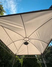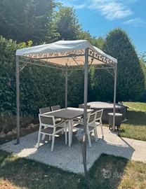 Vendo gazebo in ferro elegante, robusto con finiture particolari e copertura bianca. Il gazebo misura 2,5 metri per 2 metri. Pagato 1.500 euro, svendo perche devo liberare il giardino per lavori!