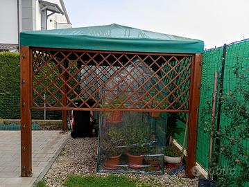 con coperture laterali scorrevoli in nylon (buone condizioni), tetto in nylon verde (come nuovo), griglie in legno su 4 lati (ottime condizioni).