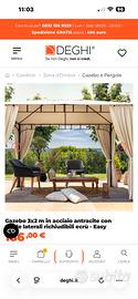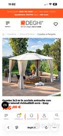 Vendo per trasloco nuovo gazebo giardino utilizzato solo per una estate, dimensioni 3metri x 2, colore struttura grigio antracite, camino antivento e corredato di tutto il set di tende laterali colore ecru’ nuove come si vede dalle foto. Gia tutto smontato, non spedisco e ritiro zona Pisa luogo dove si trova l oggetto. Per info 3425199987- oppure 3461238948.