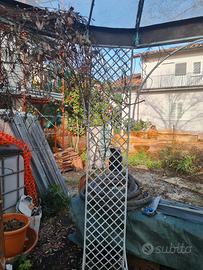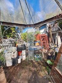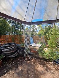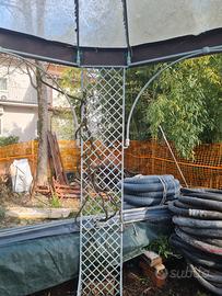 Vendo gazebo in ferro battuto tonda, con diametro di 336 cm e 236 cm di altezza, come struttura é in ottimo stato, ma ha bisogno di manutenzione del colore e la copertura è da rifare