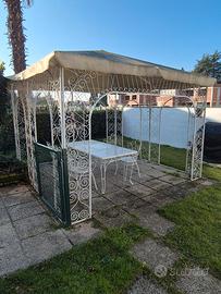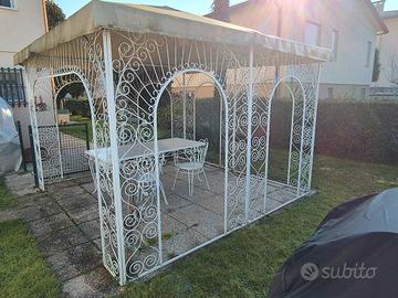 vendo gazebo in ferro con tavolo e 4 sedie sempre in ferro,il tutto zincato antiruggine,la copertura in PVC. misura 3,40 X3,40 metri e su un lato arco da 2,60 m.ideale per mettere al coperto un' auto.chi è interessato deve organizzare smontaggio e trasporto.