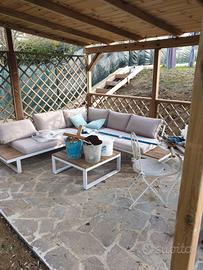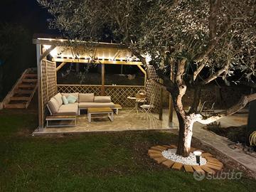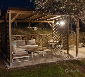 Struttura in legno trattato per esterni, resistente a pioggia, sole e agenti atmosferici. La struttura è attualmente montata e ha 5 anni di vita. Non è in perfette condizioni, ma si sa, il legno è eterno. Basta una carteggiata e una nuova impregnata.