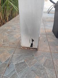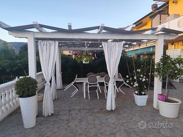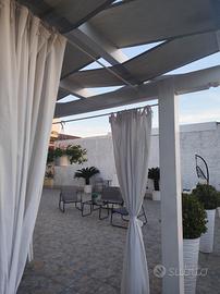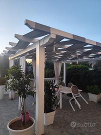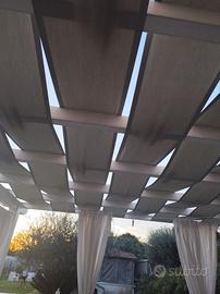 Gazebo in legno verniciato, pianta quadrata delle dimensioni 4 metri x 4,5 metri. Le travi sono 20x20 e le travi sporgono di mezzo metro a lato. Sono inclusi i teli e le tende che sono allestite su due lati. Alla base vi sono le staffe di fissaggio. Il prezzo proposto tiene conto di alcuni difetti del legno che va trattato. Smontaggio e trasporto a carico dell'acquirente, prezzo leggermente trattabile.