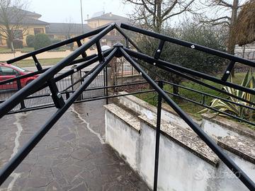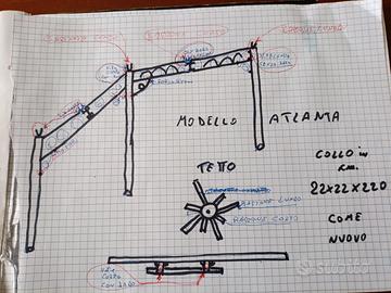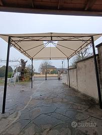 gazebo in acciaio verniciato nero opaco con doppio tetto per scaricare il vento montato una sola volta,come nuovo.montato alcuni giorni fa per verificare che non manchi niente.dimensioni m.3x3-alt. m.2.20-alt in punta m.2.60 sez pali cm 4x4 cop.poliest.beige-manca solo la copertura scarico vento cm40x40