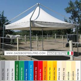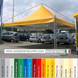 Il telo di copertura è realizzato in fibre di poliestere e presenta una spalmatura in PVC sui lati, insieme a un trattamento protettivo PVDF. Questo assicura una resistenza superiore e una facile manutenzione del gazebo.