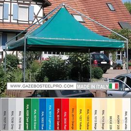 Il gazebo Pagoda Basic viene fornito con un telo gazebo 3x3 nella sua versione base. La struttura portante è composta da fibre di poliestere, garantendo una solida resistenza. Su entrambi i lati del telo viene applicata una spalmatura in PVC ignifugo con protezione PVDF, assicurando una protezione affidabile dagli agenti atmosferici.