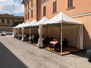 Gazebo mt 3x3 con struttura in alluminio bianco, pali di diametro 5 cm, copertura superiore in telo spalmato pvc cl2 al costo di € 400 l’uno, disponibili 25. Teli perimetrali Scorrevoli, traslucidi bianco € 25 l’uno