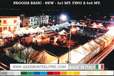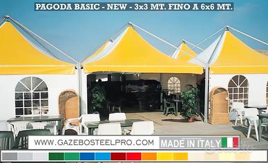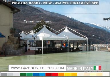 La versatilità della Pagoda Basic non si ferma qui. Aggiungendo pareti in PVC, questo gazebo può trasformarsi in un'eccellente struttura chiusa, adattabile a diverse situazioni. Che tu stia cercando una copertura per spazi commerciali o un riparo per locali pubblici o privati, la Pagoda Basic si adatta perfettamente alle tue esigenze.