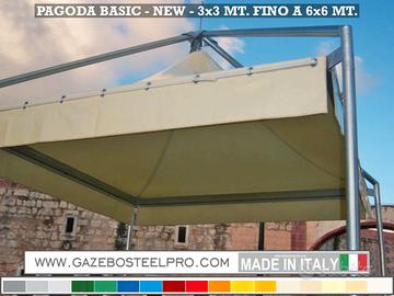 Il gazebo Pagoda Basic viene fornito con un telo gazebo 3x3 nella sua versione base. La struttura portante è composta da fibre di poliestere, garantendo una solida resistenza. Su entrambi i lati del telo viene applicata una spalmatura in PVC ignifugo con protezione PVDF, assicurando una protezione affidabile dagli agenti atmosferici.