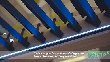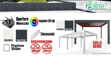 La bioclimatica BioS è la nuova pergola di gamma superiore con motorizzazione e controllo remoto di serie e impianto LED integrato.