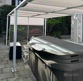 Vendo in ottime condizioni Gazebo Pergola Stile bioclimatica con doppia tenda per tutta la lunghezza. 8 piantoni (4+4) è quindi possibile dividerli in due senza problemi Ideale per copertura idromassaggio, jacuzzi, piscina, zona relax a casa con lettini, sedie, divano da giardino, Possibile trasporto se nel corto raggio o spedizione possibile a euro 40. Si vende solo per cessione immobile