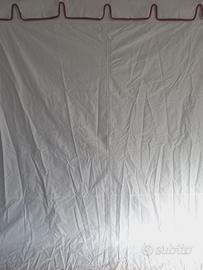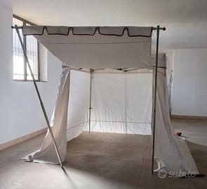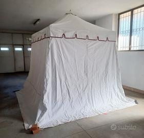 Gazebo in tessuto spalmato e impermeabile, realizzato su misura come tenda medioevale, la base misura 3 m x 3 m e la copertura del tetto 2 m x 2m, con merlature decorative e sfere dorate. Parete frontale apribile a tettoia e parete del retro apribile mediante cerniera centrale. Utilizzato solo per due manifestazioni di 4 giorni ciascuna. Vendo a 400 euro Non effettuo spedizioni. Disponibile solo per il ritiro in loco.