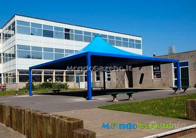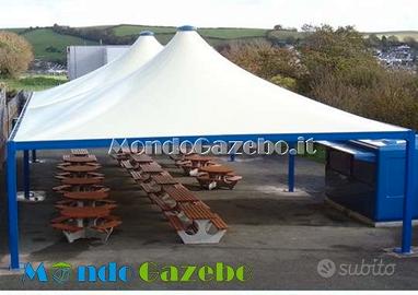 Gazebo fisso WIND 14x14 m Gazebo fisso confezionato al momento dell'ordine, lasciando ampia disponibilità di personalizzazione di colori di telo ed eventuale elettroverniciatura a polveri. (opzionale). CONSEGNA gazebo professionale: da valutarsi a preventivo. GAZEBO TENDONE COPERTURA OMBREGGIANTE PERGOLA VELA GARAGE CAPANNONE OMOLOGAZIONE DEL GAZEBO USO PUBBLICO. FATTURABILE. La ns azienda è accreditata MEPA, ovvero siamo certificati dal Ministero dell'economia e delle finanze a fornire le Pubbliche Amministrazioni STRUTTURA GAZEBO : Il gazebo fisso ha piantoni tubolari in acciaio zincato a caldo: - Gamba a sez. Quadrata 175x175mm Il gazebo fisso ha Travi perimetrali 200x150 mm acciaio zincato a caldo. Piastra metallica per ancoraggio a terra del gazebo, con fori per eventuale tassellamento. Certificato e collaudato per la spinta al vento fino 120Km/h. H sottotrave: fino a 280cm standard, oltre a preventivo. RACCOLTA ACQUA PIOVANA: sistema di raccolta acqua di deflusso mediante grondaia integrata nella trave perimetrale, con scarico alla base dei montanti verticali. TELO GAZEBO: IL telo del gazebo è in PVC ad alta densità con grammatura pesante di 650 g/m2 ignifugo certificato classe 2. Conforme alle normative antincendio vigenti. Il telone di copertura del tendone è costituito da tessuto di supporto in fibre poliestere spalmate da ambedue i lati in PVC garantisce un'alta resistenza alla lacerazione e all'azione deteriorante degli agenti atmosferici. Classe di resistenza al fuoco 2. Numero di fili a cm. 9/9, spessore filato 2 x 1100, peso 650 gr./mq I GAZEBO SONO DISPONIBILI IN VARIE MISURE 7X7 5,5X7,5 - 7,5x5,5 8X8 9X9 10X10 11X11 12X12 13X13 14X14 15X15 Chiamaci per qualsiasi informazione! CHI SIAMO: Mondo Gazebo il riferimento italiano per la progettazione, fornitura e posa in opera di qualsiasi struttura temporanea mobile. Gazebo fisso SERRA CASETTA LEGNO CAPANNONE TENDONE PER FESTE COPERTURA VEICOLI Grande professionalità - Giusto prezzo.