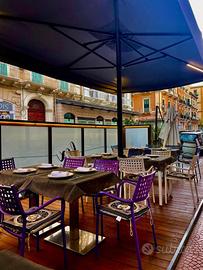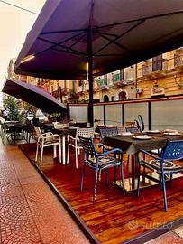 Gazebo per bar-ristoranti Pedana in inox Copertura in legno Vetrata Ombrellone professionale con accenzione a luci led all'interno. 24 sedie in ferro 6 tavoli 2 tavoli alti con 6 sgabelli alti per aperitivo.