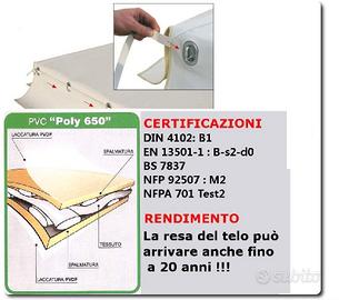Telo copertura in PVC ignifugo lucido con trattamento di protezione PVDF (garantisce un elevata resistenza agli eventi atmosferici e un miglio mantenimento della pulizia delle superfici)