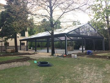 Scheletro di gazebo in ferro color grigio ferro di 150 mq altezza 2 mt minimo e 4 mt max . Possibilità di avere teli laterali in pvc con apertura e chiusura elettrica e grondaie e pluviali stesso colore grigio ferro