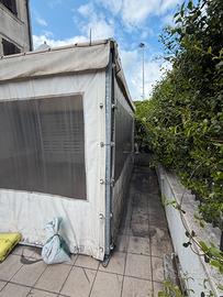 Gazebo / tensostruttura 4x4 m con due chiusure laterali – struttura robusta Vendo gazebo/tensostruttura dimensioni circa 4x4 metri, ideale per giardino, attività o uso esterno (tipo dehors). ✔ Struttura in metallo resistente ✔ Copertura in PVC ✔ Due teli laterali con finestre trasparenti ✔ Buona stabilità (già zavorrato) Condizioni: usato, telo con segni del tempo e sporco ma ancora utilizzabile. Smontaggio e trasporto a carico dell’acquirente. Prezzo: 800 € trattabili