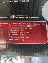 Generatore a benzina Capacità serbatoio 12litri Tensione noninale 220v/380v frequenza nominale 50Hz Motore 5.5 CV Cilindrata 163cc Nuovo con scatola originale mai utilizzato