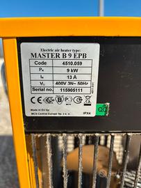 Generatore di aria calda elettrico Master B9 EPB trifase, termostato incluso. Portata aria generata 800 m3/h molto utile per scaldare rapidamente ambienti molto spaziosi e arieggiati. Alimentazione 400V, potenza max 9kW. Usato pochissimo condizioni pari al nuovo, vendo per inutilizzo.