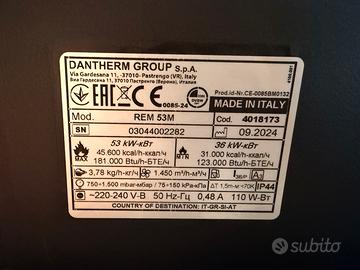 Potenza termica nominale 53 kW, alimentazione elettrica 220 V, consumo max3,78 kg/h, pressione di alimentazione 1500 mbar, portata d'aria 1450 m/h,accensione piezoelettrica, sistema di controllo funzionamento mediantetermocoppia e termostato sovratemperatura, L60,5xP27,6xH44,4 cm, peso 12,5 kg.