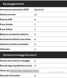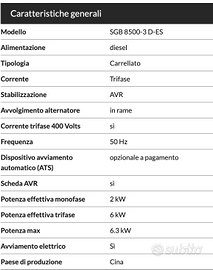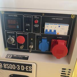SOLO RITIRO NO SPEDIZIONE Generatore di Corrente trifase Blackstone SGB 8500-3 D-ES Generatore DIESEL SILENZIATO Blackstone SGB 8500-3 D-ES è un prodotto semiprofessionale ideale per i privati. Questo modello ha un alternatore completamente avvolto in rame e un capiente serbatoio da ben 12,7 litri. Monta un motore diesel 4 tempi con una cilindrata di 498 cc in grado di emanare una potenza di 13 Hp (9,6 kW). L' accensione è semplificata grazie al comodo avviamento elettrico con chiavi. Grazie alla sua forma molto compatta e alle 4 ruote risulta anche molto semplice da utilizzare anche nei luoghi più complicati. Il generatore riesce ad emettere una potenza massima in uscita di 6300 kW. Grazie ai rivestimenti e alla marmitta residenziale, il generatore diesel è particolarmente indicato per il lavoro in prossimità di centri abitati. Dotato di scheda AVR: fornisce una regolazione automatica della tensione in uscita, rendendola sempre e comunque perfettamente costante al variare del carico Il generatore può lavorare con una temperatura compresa tra i 5° e i 40° e con un'altitudine non sopra i 1000m. Il generatore non è concepito per essere inserito in un impianto di pannelli fotovoltaici o solari per la produzione di energia, né per la ricarica o manutenzione di batterie di questi impianti o altri tipi di impianti di altra natura; questo utilizzo può danneggiare seriamente il generatore.