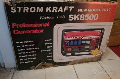 Vendo generatore di corrente professionale Marca: Strom Kraft Modello: SK8500 Caratteristiche: - Potenza di picco: 8500w - Potenza nominale: 8000w - Frequenza nominale: 50hz - Tensione nominale: 220v/380v - Fattore di potenza: 1.0 - Peso lordo: 40kg - Peso netto: 38kg Nuovo - Mai utilizzato