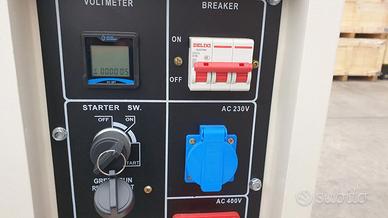 Generatore di corrente diesel monofase trifase 230V - 380V - 12V silenziato, potenza 10 kW/11KVA. Specifiche tecniche: Motore: Diesel monocilindrico 4 tempi Accensione: Elettrica a batteria Potenza Massima: 10kW Frequenza: 50Hz Regolatore di Tensione: Automatico (AVR) Sistema di Raffreddamento: Aria forzata Peso: 185kg Rotazione Motore: 3000 giri al minuto Display: Digitale (Conta ore e Voltimetro)