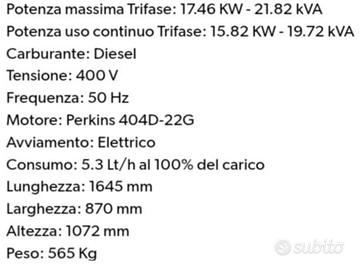 Vendo gruppo elettrogeno pramac da 20kwa. generatore pari al nuovo con poche ore di utilizzo circa 290. caratteristiche techniche i foto allegate. Generatore dotato di regolari documenti e certificazioni CE originali. Per info e contatti 328 817 5396 angelo.