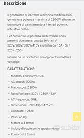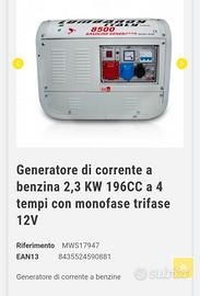 Gruppo elettrogeno inverter a benzina nuovo. Accensione a tiro facilitata. Silenziato. Regola i giri in base al l'assorbimento. Escono la 12V, la Monofase e la trifase. Ottimo per lavori in campagna, per emergenze o per ambulanti.