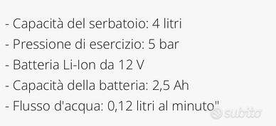"Il nebulizzatore funziona in maniera automatica e sicura: l'intuitivo display posto sulla parte frontale permette di impostare la frequenza e la durata dei cicli, mentre un timer acustico segnala l'entrata in funzione con 30 secondi di anticipo, dando così la possibilità di allontanarsi prima del trattamento. Alimentato da una batteria Li-Ion ricaricabile da 12 V, estraibile velocemente grazie al sistema fast click-in, potrete posizionarlo facilmente nei punti strategici del vostro giardino: a terra oppure appeso grazie alla pratica tracolla inclusa che garantisce la massima flessibilità nel posizionamento. L'autonomia della batteria è di 90 minuti effettivi di lavoro. I tre ugelli a nebulizzazione ultra-fine permettono di avere una distribuzione del prodotto omogenea a 360°, per una maggiore efficacia dei trattamenti. Le guarnizioni speciali in FPM lo rendono idoneo anche all'utilizzo dei prodotti più aggressivi. Il nebulizzatore è utilizzabile anche per la sanificazione di ambienti interni e per la nebulizzazione di altri liquidi.