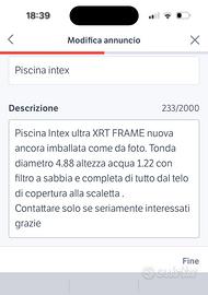 Piscina fuori terra come da descrizione, mai aperta e usata per inutilizzo, ancora imballata pronta per il ritiro. Spedizione a carico dell'acquirente