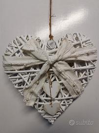 CUORE IN FILI DI LEGNO con 2 cuoricini più piccoli . Nastro in stoffa con passamaneria e perle.... Diametro cm 30..... Euro 17